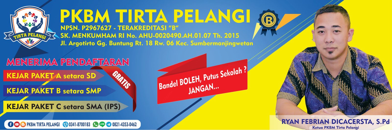 PKBM Tirta Pelangi adalah Pusat Kegiatan Belajar Masyarakat swasta yang berlokasi di Kecamatan Sumbermanjing Wetan, Kabupaten Malang, Jawa Timur. Didirikan pada tahun 2011, kami berkomitmen penuh untuk menyediakan akses pendidikan dan pengembangan keterampilan bagi seluruh lapisan masyarakat, mulai dari anak usia dini hingga dewasa.